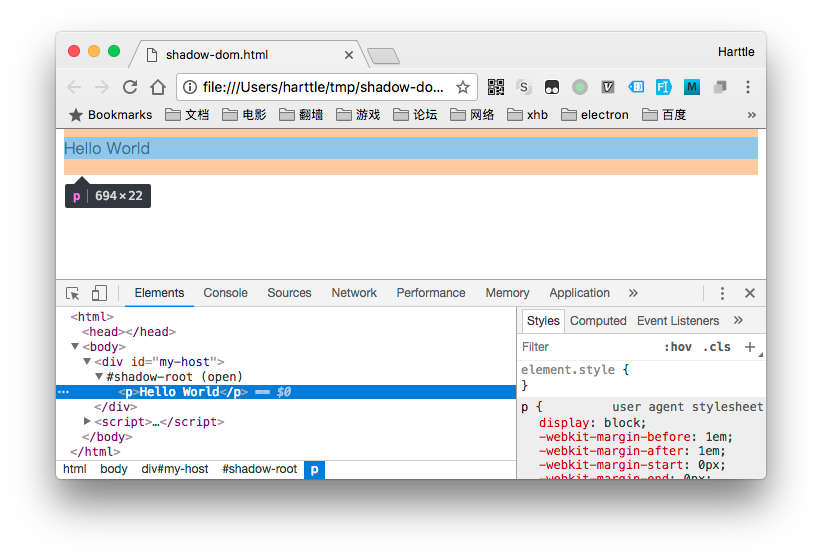 并使用预定义的模板进行了填充。Shadow DOM 特性也可以独立,比如下面的例子: