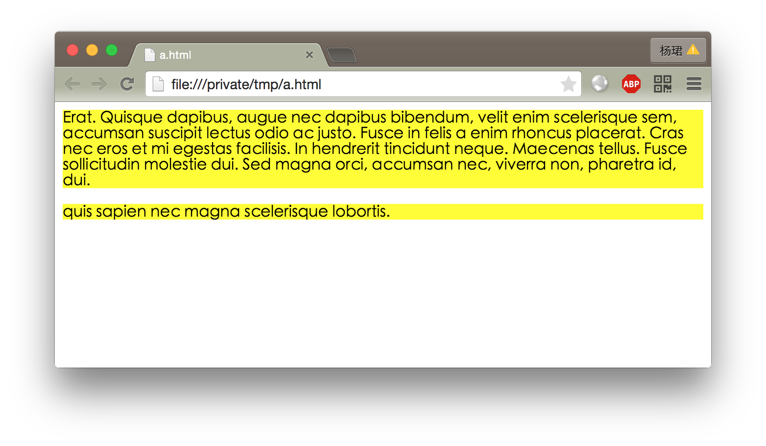 块(block)元素会中断当前的文本流,另起一行,并在父元素中尽可能地占据最大宽度。常见的块元素有<p>,<div>,<section>等。通常块元素不可包含在行内元素内部。例如下面的两个<p>标签,不论内容是否足够,都会占据整个body的宽: