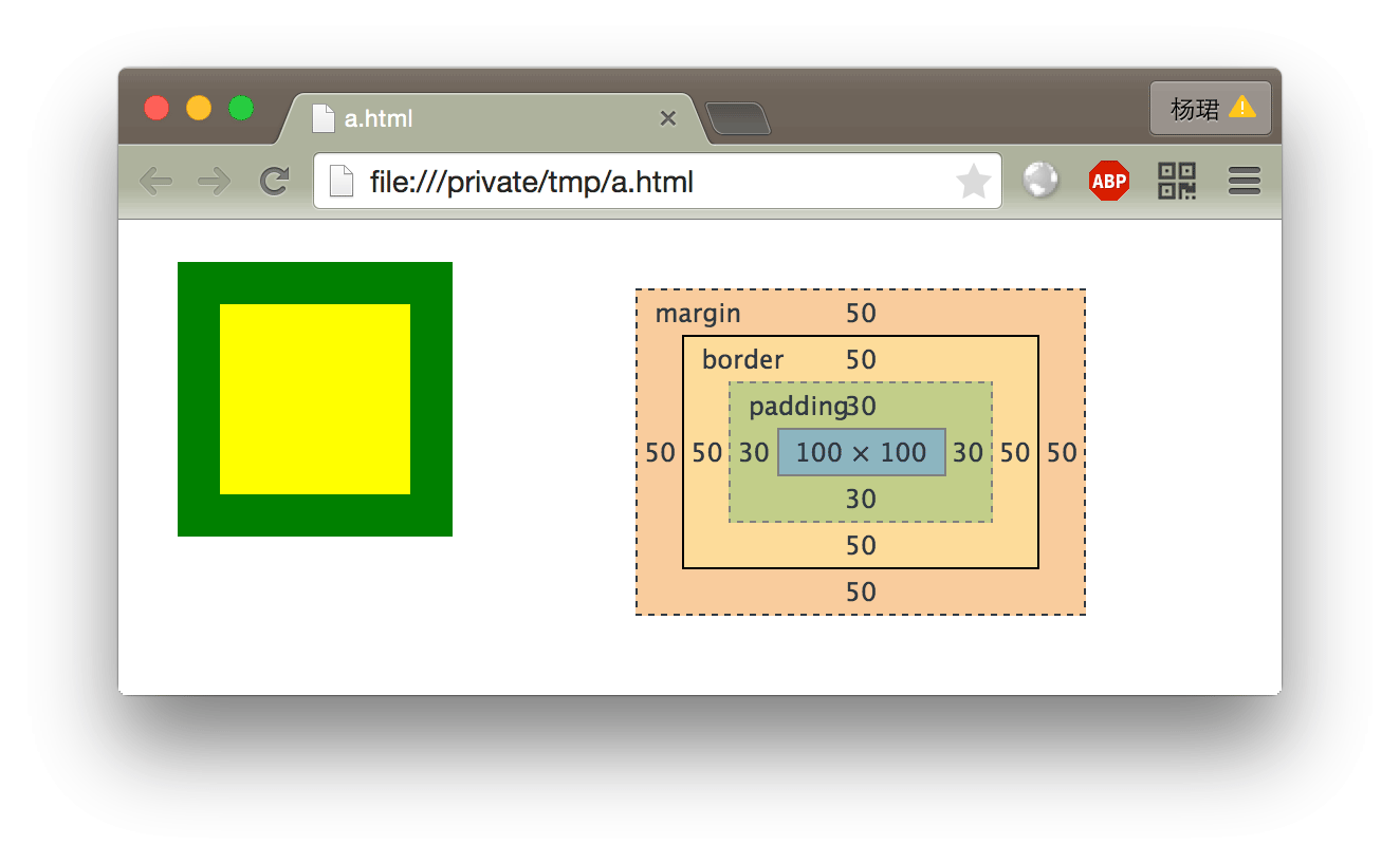 - 黄色的背景作用于内容和内边距构成的矩形,其宽高为