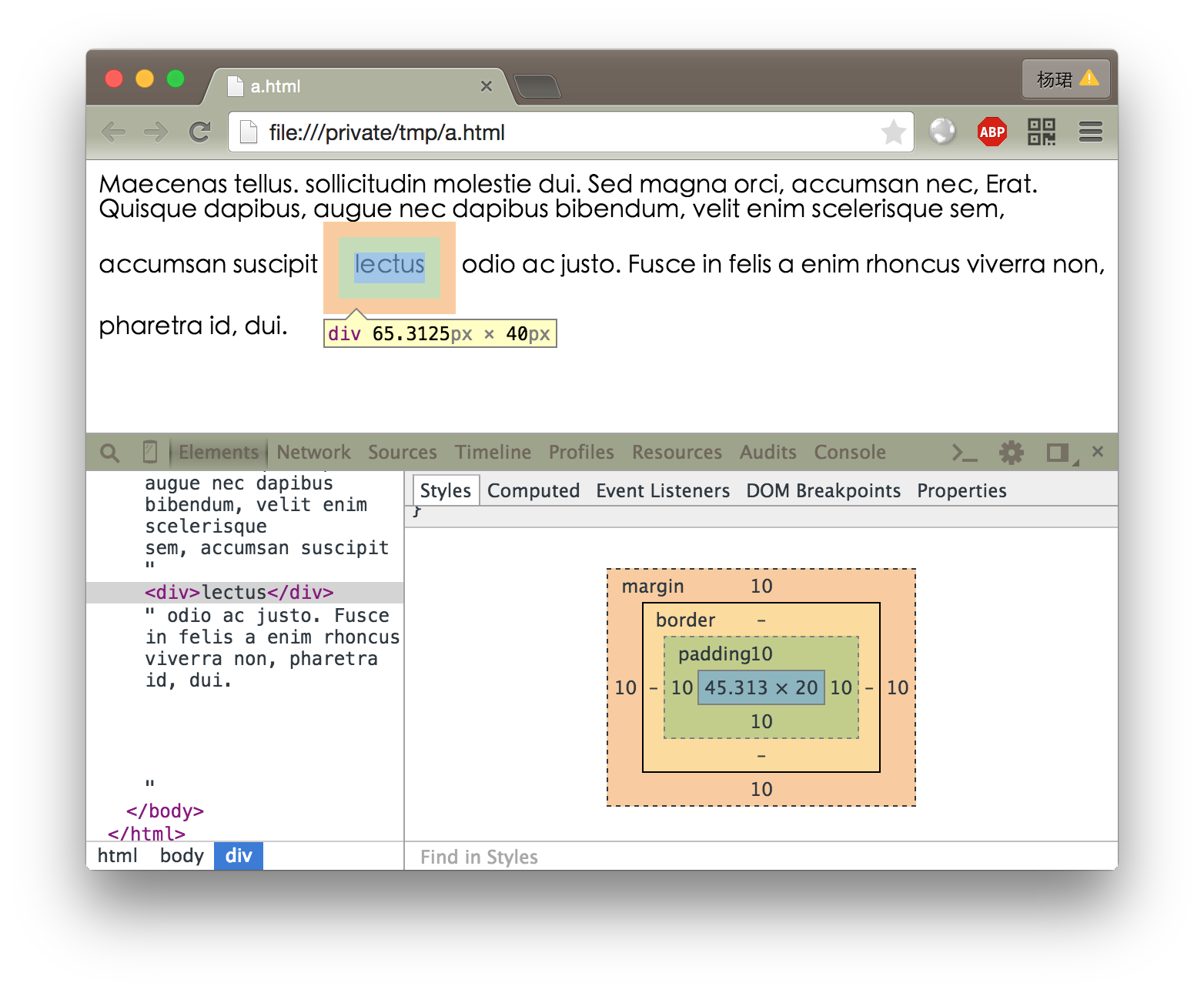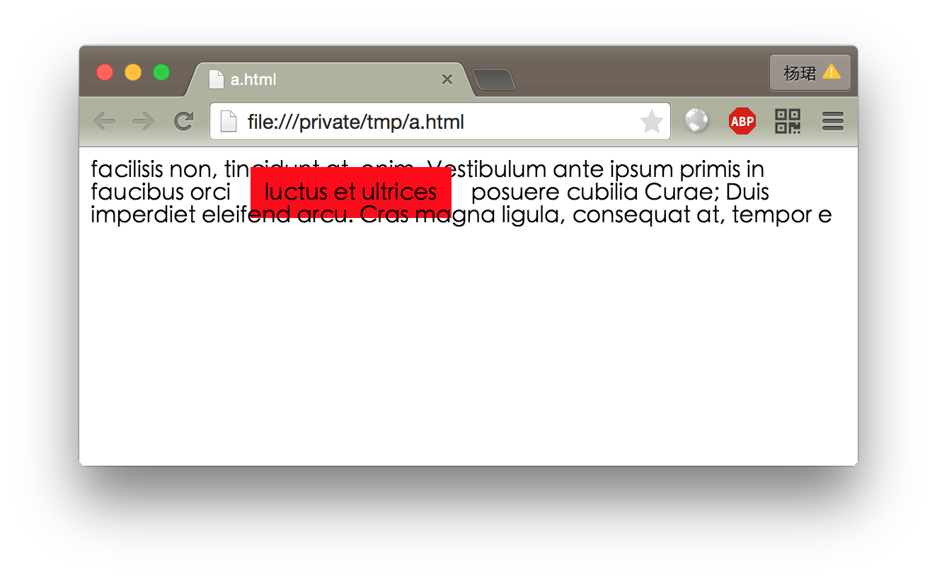 上图中,红色背景的是一个<div>,其大小为内容大小+padding;左右的空隙即为外边距margin。可以看到在Chrome中,这个inline的<div>遮挡了出现在它前面的文本,同时被出现在它后面的文本所遮挡。这正是流式文档的特性。